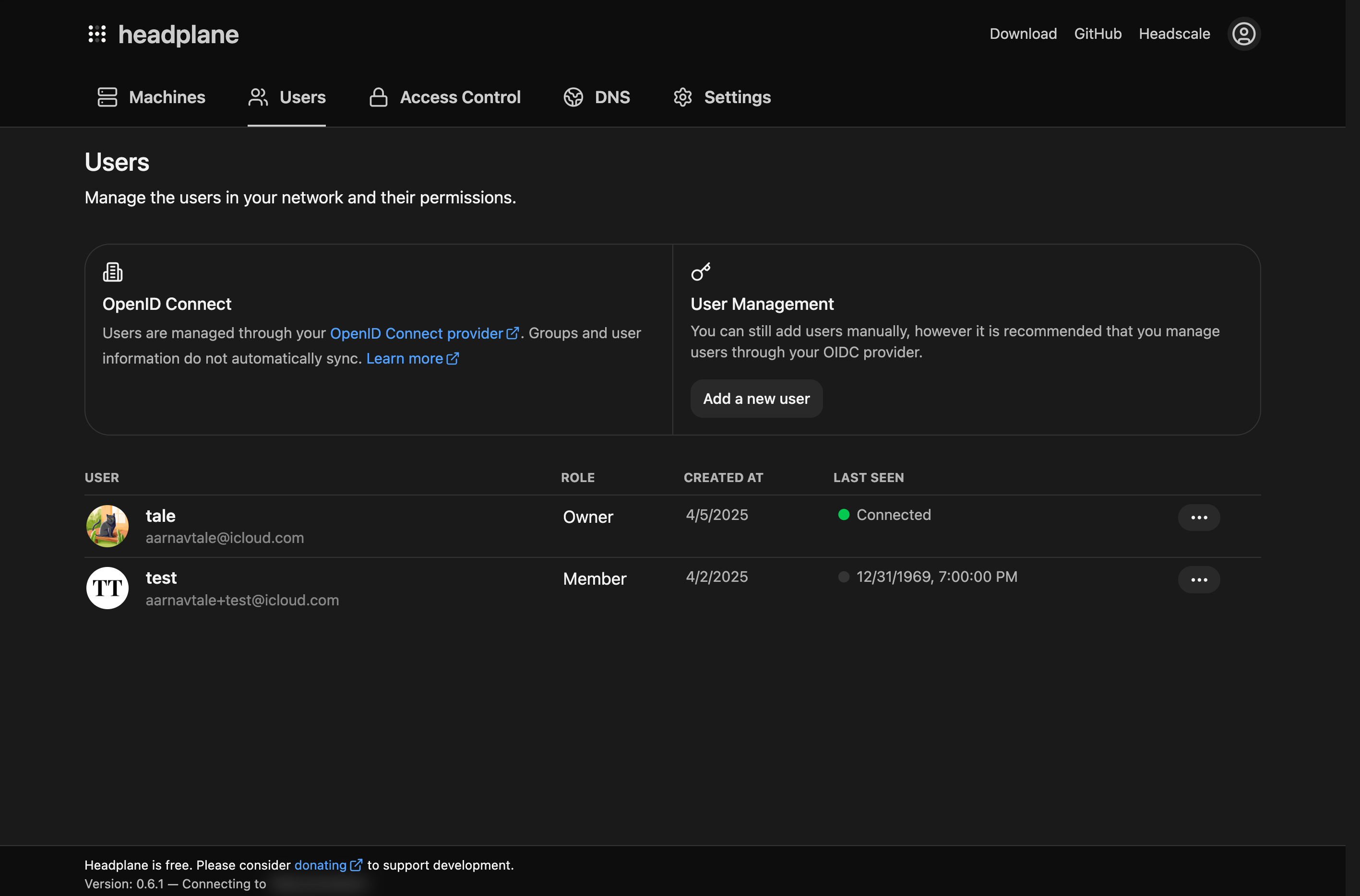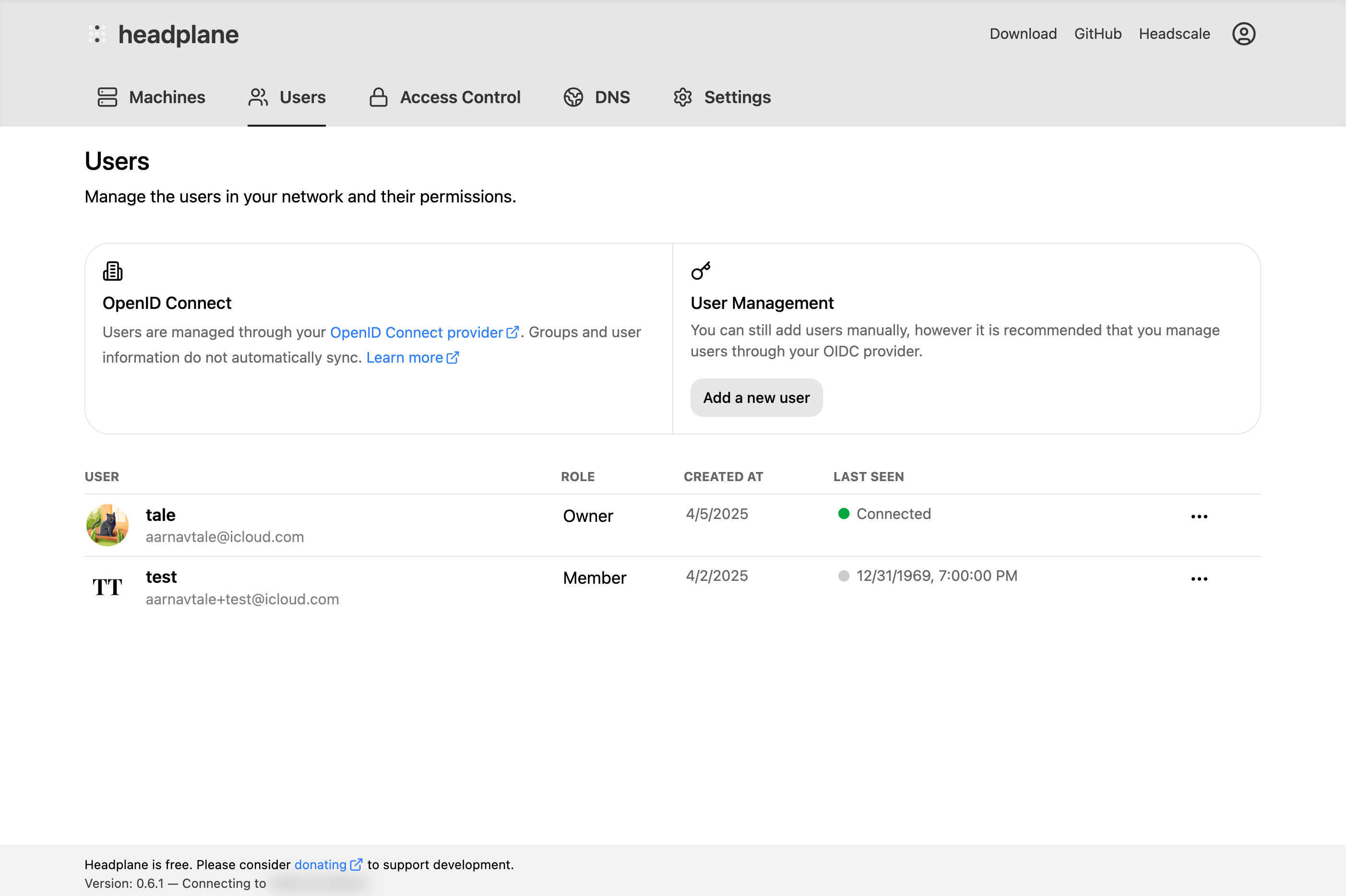 In this case, Headplane will prompt the user during onboarding to manually select which Headscale user they are. This selection is persisted, so it only needs to happen once. After linking, all ownership-based features (viewing your own machines, self-service pre-auth keys, WebSSH) work normally.
